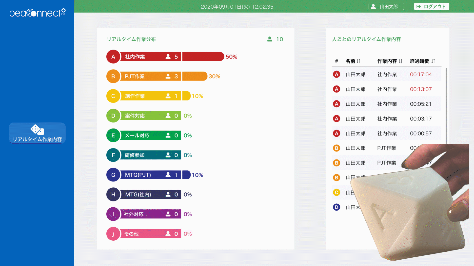 Smart CUBE, a dice-shaped IoT device, automatically converts man-hours of users into data by linking each surface to the work to be managed. This eliminates the need to manually input man-hours on paper or PC. Even if the person in charge is not on site, he/she can visualize the work status of each person in charge and the totaled data on the beaconnect plus Web screen, enabling appropriate approaches to the workers.