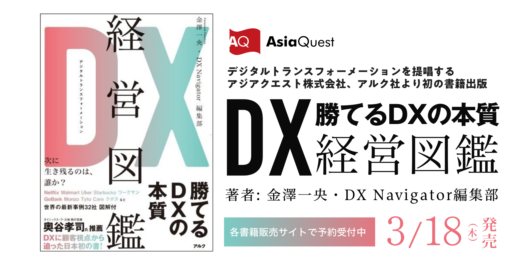 Based on a year and a half of knowledge gained by the editorial department of DX Navigator, AsiaQuest's DX information media, "DX Management Guide" will be published by ALC, edited by Kazuo Kanazawa, CMO/DX Strategy Manager of AsiaQuest and chief editor of DX Navigator.