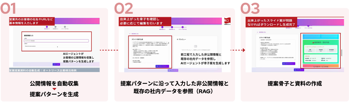 新規取引先への製品・ソリューション提案資料をAIが自動生成。